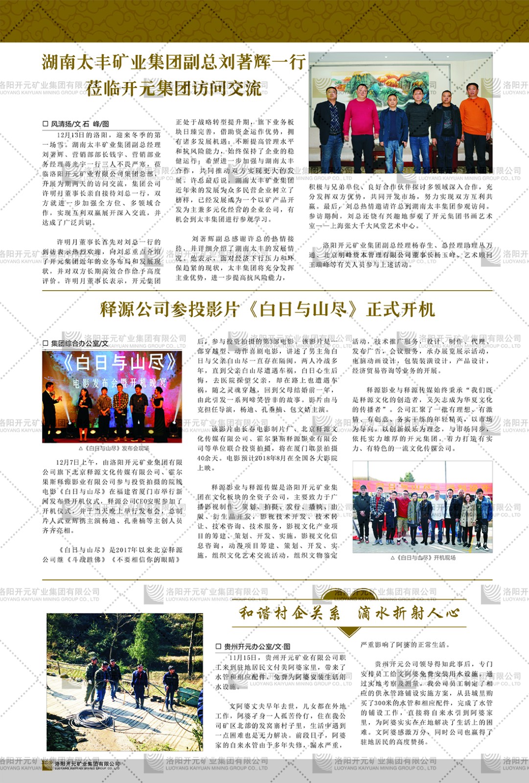 洛陽開元礦業(yè)集團有限公司簡介洛陽開元礦業(yè)集團有限公司,始成立于2006年,位于洛陽市開元大道269號。集團旗下共有十余家全資子公司,業(yè)務(wù)涉及有色金屬礦山開發(fā)、礦產(chǎn)品購銷與進出口貿(mào)易、房地產(chǎn)開發(fā)、文化藝術(shù)、企業(yè)管理與咨詢、資本投資等多個領(lǐng)域。2024年,集團公司銷售總額達(dá)7.8億元。民建河南省委委員、民建河南省委企業(yè)委副主任、民建洛陽市委委員、企業(yè)委主任、洛陽民建企業(yè)家協(xié)會會長許明月是公司創(chuàng)始人,現(xiàn)任洛陽開元礦業(yè)集團有限公司董事長。在礦業(yè)領(lǐng)域,洛陽開元礦業(yè)集團擁有多家實力雄厚的子公司:貴州開元礦業(yè)有限公司探、采礦權(quán)面積共11.33平方公里;興??h銅鑫礦業(yè)有限公司探礦權(quán)面積8.76平方公里,礦山資源潛力巨大;2021年,開元集團與盧氏中科礦業(yè)有限公司開展戰(zhàn)略合作。盧氏中科礦業(yè)有限公司專注于有色金屬的浮選、加工和銷售,擁有強大的技術(shù)支撐平臺,是集探、采、選、冶、研為一體的中大型綜合礦業(yè)企業(yè)。目前,盧氏中科王家河1000噸選礦廠已成功投產(chǎn),雙河金礦、柳關(guān)欒盧鉛鋅礦相繼順利開工,樓房銀礦與圪老灣鉛鋅礦的深部探礦重大突破,標(biāo)志著礦山版圖取得重大進展,為開元集團后續(xù)發(fā)展奠定了堅實基礎(chǔ)。在文化傳媒領(lǐng)域,洛陽市明月美術(shù)館通過豐富多樣的藝術(shù)展覽、學(xué)術(shù)研討和公共教育活動,努力打造一個集展覽、交流、教育、研究為一體的綜合性藝術(shù)平臺。此外,在金融投資領(lǐng)域,開元集團旗下的北京明峰資本管理有限公司專注于投資具有高增長潛力的優(yōu)秀企業(yè),特別是高科技、新能源、環(huán)保等新興產(chǎn)業(yè),為客戶提供個性化的資產(chǎn)配置服務(wù)。在做好企業(yè)經(jīng)營的同時,開元集團始終不忘企業(yè)的社會責(zé)任和家國情懷,以突出的愛心公益事跡,開展了一系列公益慈善活動:“民建林”公益事業(yè)通過“思源基金”“幫幫公益”線上公益平臺,與眾多愛心人士籌措資金20余萬元;資助541名貧困大學(xué)生共計270余萬元,推進“數(shù)字助力——河南AI人才培養(yǎng)”;捐款10萬元,馳援京津冀、黑龍江洪水地質(zhì)災(zāi)害……公司于2017年底被洛陽市慈善總會評為“洛陽慈善風(fēng)云榜——十大愛心集體”。洛陽開元礦業(yè)集團有限公司秉承持續(xù)發(fā)展理念,憑借多年來良好的企業(yè)信譽與經(jīng)營業(yè)績,與全國多家企業(yè)建立了良好合作關(guān)系,受到社會各界的一致好評,多次榮獲“納稅標(biāo)兵”“先進企業(yè)”“招商引資模范企業(yè)”等榮譽稱號?;赝麃頃r路,開元人勠力同心,以“闖”的精神和“創(chuàng)”的勁頭,一路披荊斬棘,踏過千山萬水;展望新未來,開元人凝心聚力,不執(zhí)于“舊”,無畏于“新”,秉承“勇于跨越,追求卓越”的企業(yè)精神,乘著國家高質(zhì)量發(fā)展新征程的東風(fēng),跨過高山,越過大海,向著集團多元化、國際化的目標(biāo),逐夢遠(yuǎn)航,跨越前行!