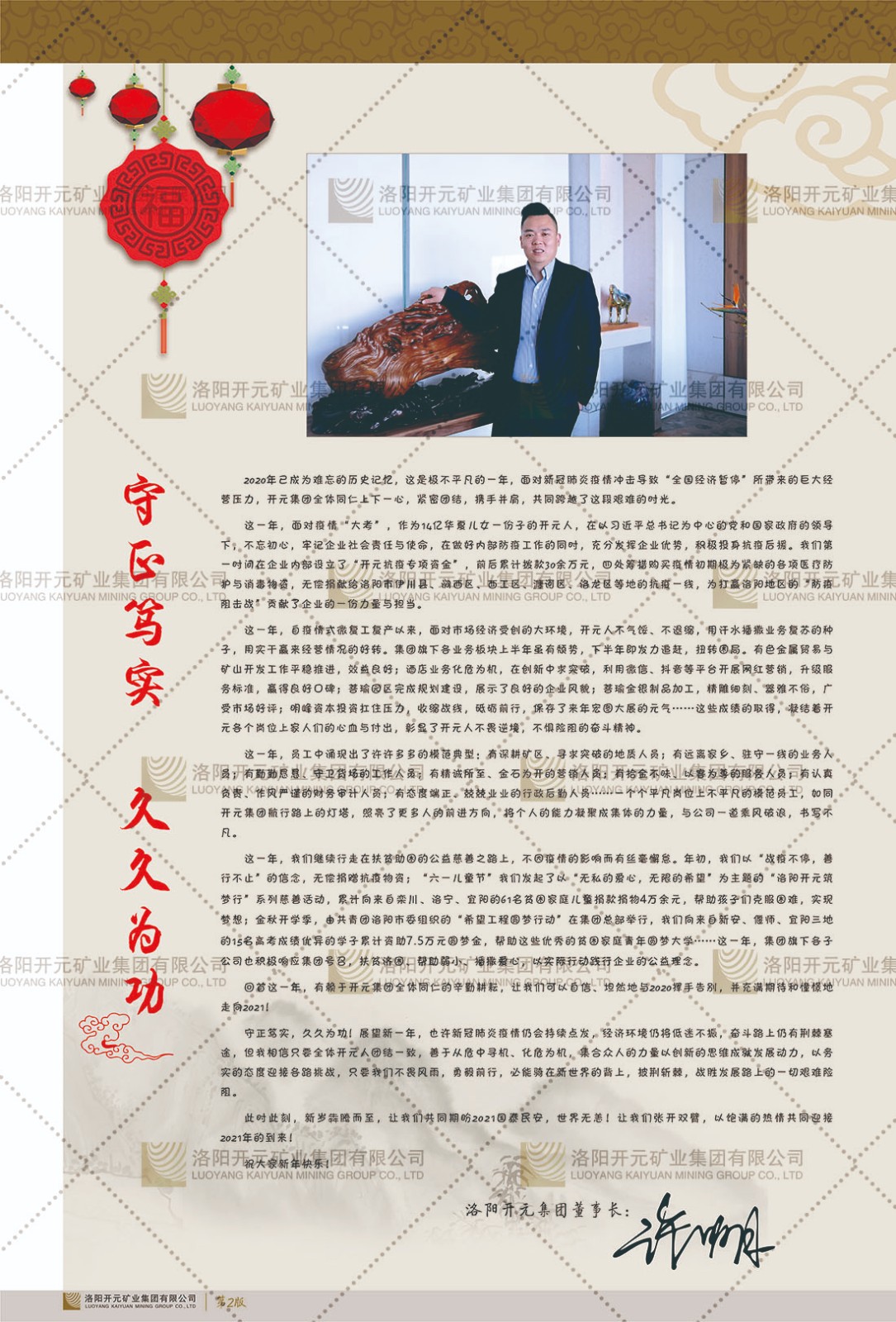 洛陽(yáng)開元礦業(yè)集團(tuán)有限公司簡(jiǎn)介洛陽(yáng)開元礦業(yè)集團(tuán)有限公司,始成立于2006年,位于洛陽(yáng)市開元大道269號(hào)。集團(tuán)旗下共有十余家全資子公司,業(yè)務(wù)涉及有色金屬礦山開發(fā)、礦產(chǎn)品購(gòu)銷與進(jìn)出口貿(mào)易、房地產(chǎn)開發(fā)、文化藝術(shù)、企業(yè)管理與咨詢、資本投資等多個(gè)領(lǐng)域。2024年,集團(tuán)公司銷售總額達(dá)7.8億元。民建河南省委委員、民建河南省委企業(yè)委副主任、民建洛陽(yáng)市委委員、企業(yè)委主任、洛陽(yáng)民建企業(yè)家協(xié)會(huì)會(huì)長(zhǎng)許明月是公司創(chuàng)始人,現(xiàn)任洛陽(yáng)開元礦業(yè)集團(tuán)有限公司董事長(zhǎng)。在礦業(yè)領(lǐng)域,洛陽(yáng)開元礦業(yè)集團(tuán)擁有多家實(shí)力雄厚的子公司:貴州開元礦業(yè)有限公司探、采礦權(quán)面積共11.33平方公里;興??h銅鑫礦業(yè)有限公司探礦權(quán)面積8.76平方公里,礦山資源潛力巨大;2021年,開元集團(tuán)與盧氏中科礦業(yè)有限公司開展戰(zhàn)略合作。盧氏中科礦業(yè)有限公司專注于有色金屬的浮選、加工和銷售,擁有強(qiáng)大的技術(shù)支撐平臺(tái),是集探、采、選、冶、研為一體的中大型綜合礦業(yè)企業(yè)。目前,盧氏中科王家河1000噸選礦廠已成功投產(chǎn),雙河金礦、柳關(guān)欒盧鉛鋅礦相繼順利開工,樓房銀礦與圪老灣鉛鋅礦的深部探礦重大突破,標(biāo)志著礦山版圖取得重大進(jìn)展,為開元集團(tuán)后續(xù)發(fā)展奠定了堅(jiān)實(shí)基礎(chǔ)。在文化傳媒領(lǐng)域,洛陽(yáng)市明月美術(shù)館通過豐富多樣的藝術(shù)展覽、學(xué)術(shù)研討和公共教育活動(dòng),努力打造一個(gè)集展覽、交流、教育、研究為一體的綜合性藝術(shù)平臺(tái)。此外,在金融投資領(lǐng)域,開元集團(tuán)旗下的北京明峰資本管理有限公司專注于投資具有高增長(zhǎng)潛力的優(yōu)秀企業(yè),特別是高科技、新能源、環(huán)保等新興產(chǎn)業(yè),為客戶提供個(gè)性化的資產(chǎn)配置服務(wù)。在做好企業(yè)經(jīng)營(yíng)的同時(shí),開元集團(tuán)始終不忘企業(yè)的社會(huì)責(zé)任和家國(guó)情懷,以突出的愛心公益事跡,開展了一系列公益慈善活動(dòng):“民建林”公益事業(yè)通過“思源基金”“幫幫公益”線上公益平臺(tái),與眾多愛心人士籌措資金20余萬元;資助541名貧困大學(xué)生共計(jì)270余萬元,推進(jìn)“數(shù)字助力——河南AI人才培養(yǎng)”;捐款10萬元,馳援京津冀、黑龍江洪水地質(zhì)災(zāi)害……公司于2017年底被洛陽(yáng)市慈善總會(huì)評(píng)為“洛陽(yáng)慈善風(fēng)云榜——十大愛心集體”。洛陽(yáng)開元礦業(yè)集團(tuán)有限公司秉承持續(xù)發(fā)展理念,憑借多年來良好的企業(yè)信譽(yù)與經(jīng)營(yíng)業(yè)績(jī),與全國(guó)多家企業(yè)建立了良好合作關(guān)系,受到社會(huì)各界的一致好評(píng),多次榮獲“納稅標(biāo)兵”“先進(jìn)企業(yè)”“招商引資模范企業(yè)”等榮譽(yù)稱號(hào)?;赝麃頃r(shí)路,開元人勠力同心,以“闖”的精神和“創(chuàng)”的勁頭,一路披荊斬棘,踏過千山萬水;展望新未來,開元人凝心聚力,不執(zhí)于“舊”,無畏于“新”,秉承“勇于跨越,追求卓越”的企業(yè)精神,乘著國(guó)家高質(zhì)量發(fā)展新征程的東風(fēng),跨過高山,越過大海,向著集團(tuán)多元化、國(guó)際化的目標(biāo),逐夢(mèng)遠(yuǎn)航,跨越前行!